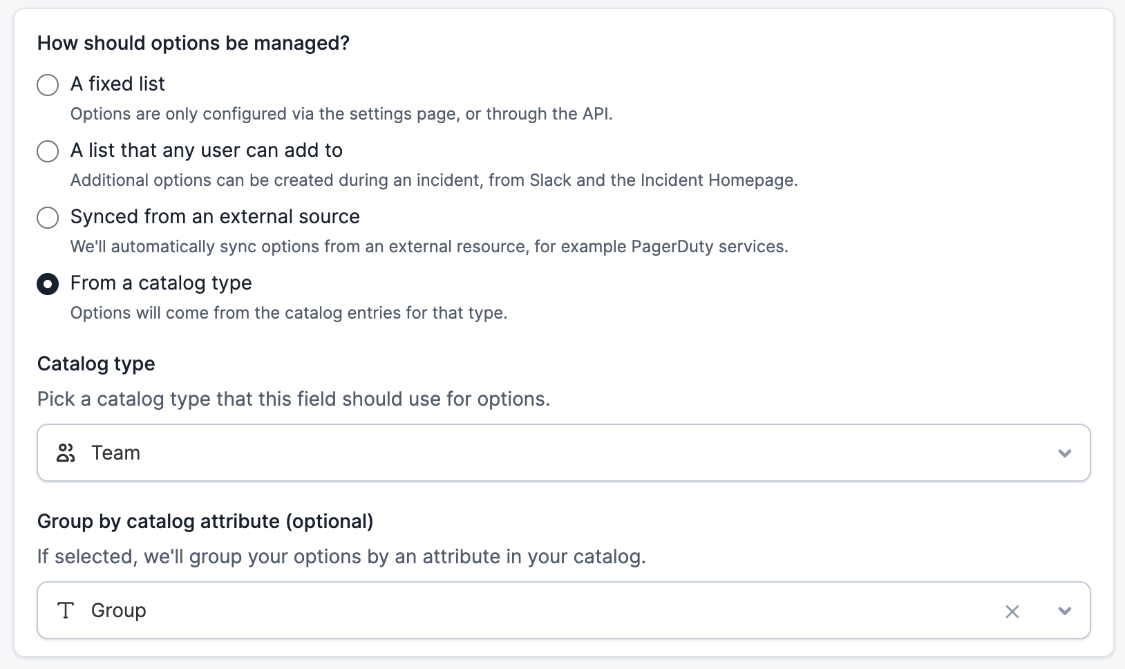 Fed up with manually maintaining options for Custom Fields? When configuring Custom Fields , select “From a catalog type” as an option for how the field should be managed. This means that any updates made to a Catalog type will be updated in this Custom Field.