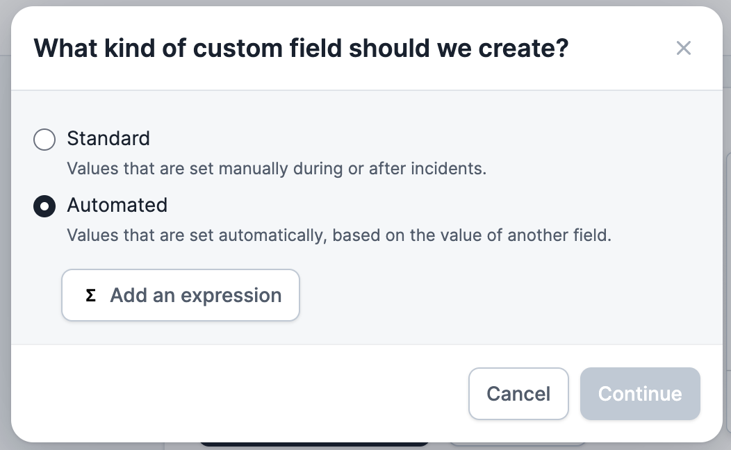 Want to update the value of a Custom Field based on the value of another Custom Field? For example, when selecting the Affected Service, using the Catalog you could derive the Affected Team without having an Incident Responder select anything. When creating a Custom Field, select Automated, and then Add an expression.
