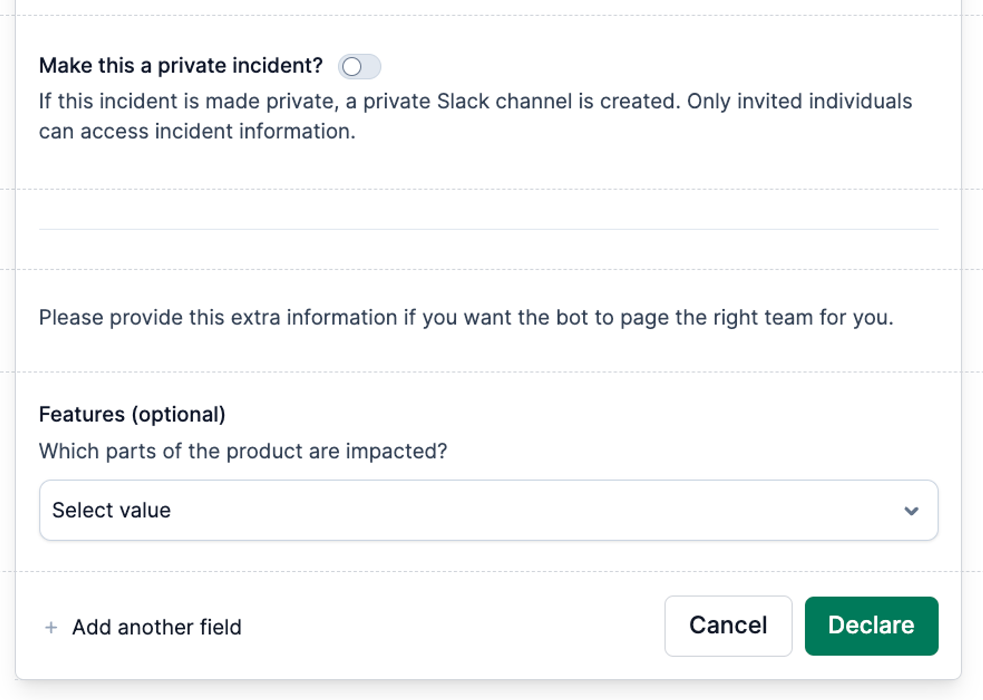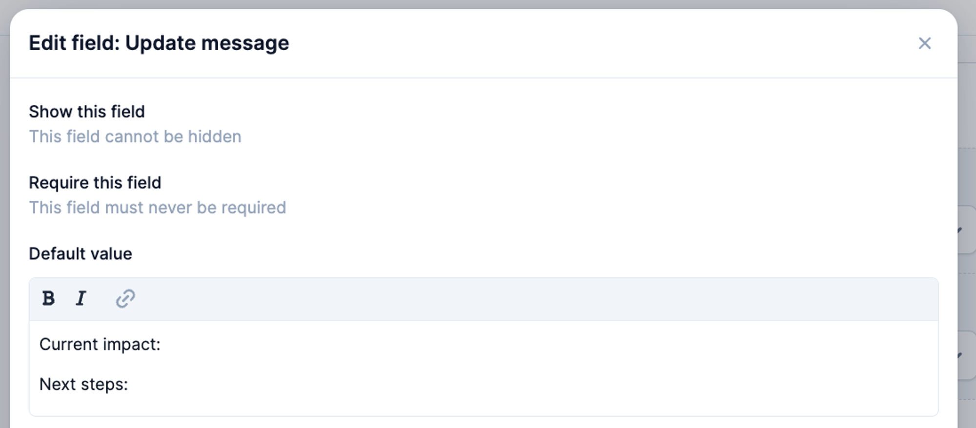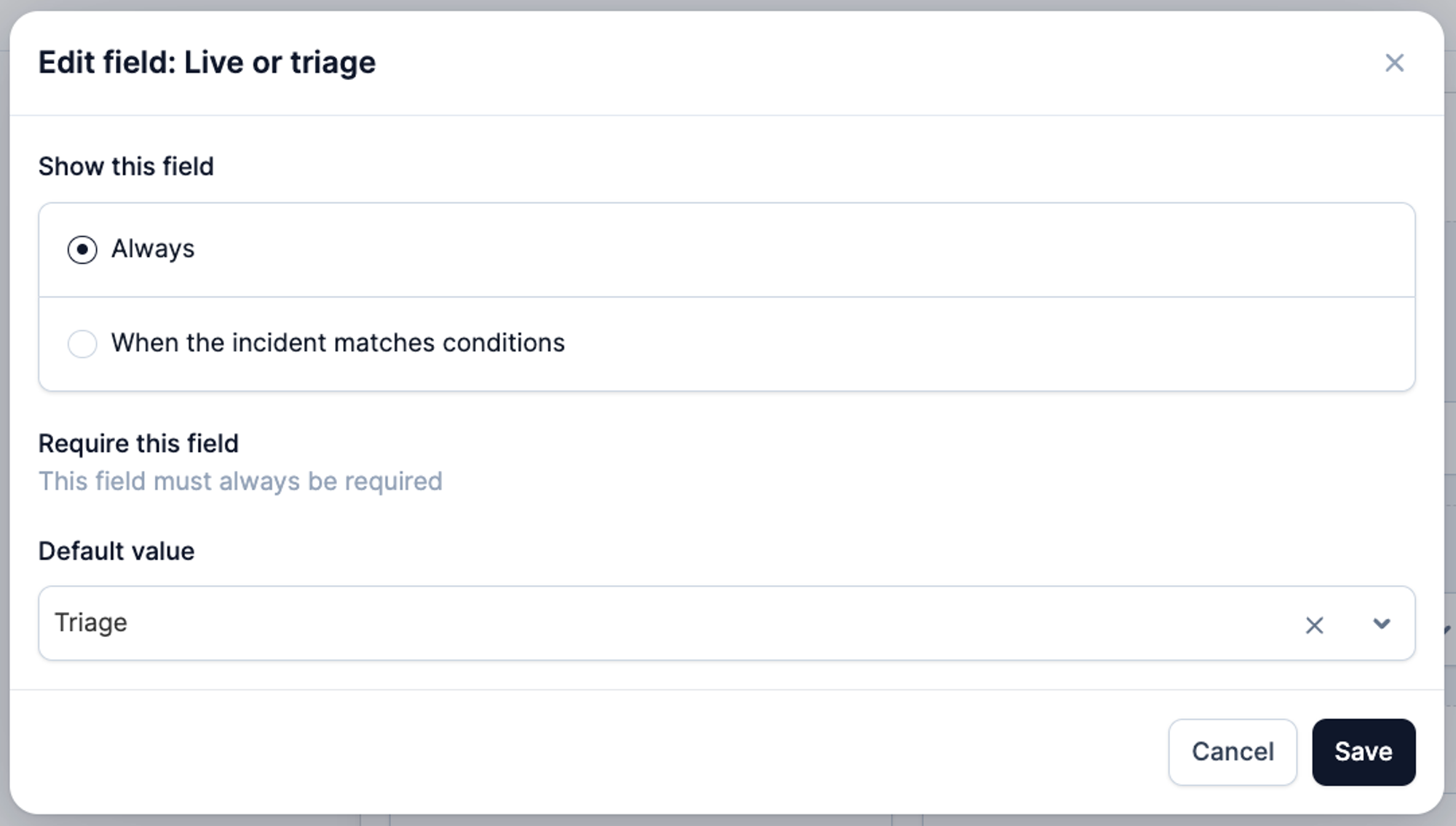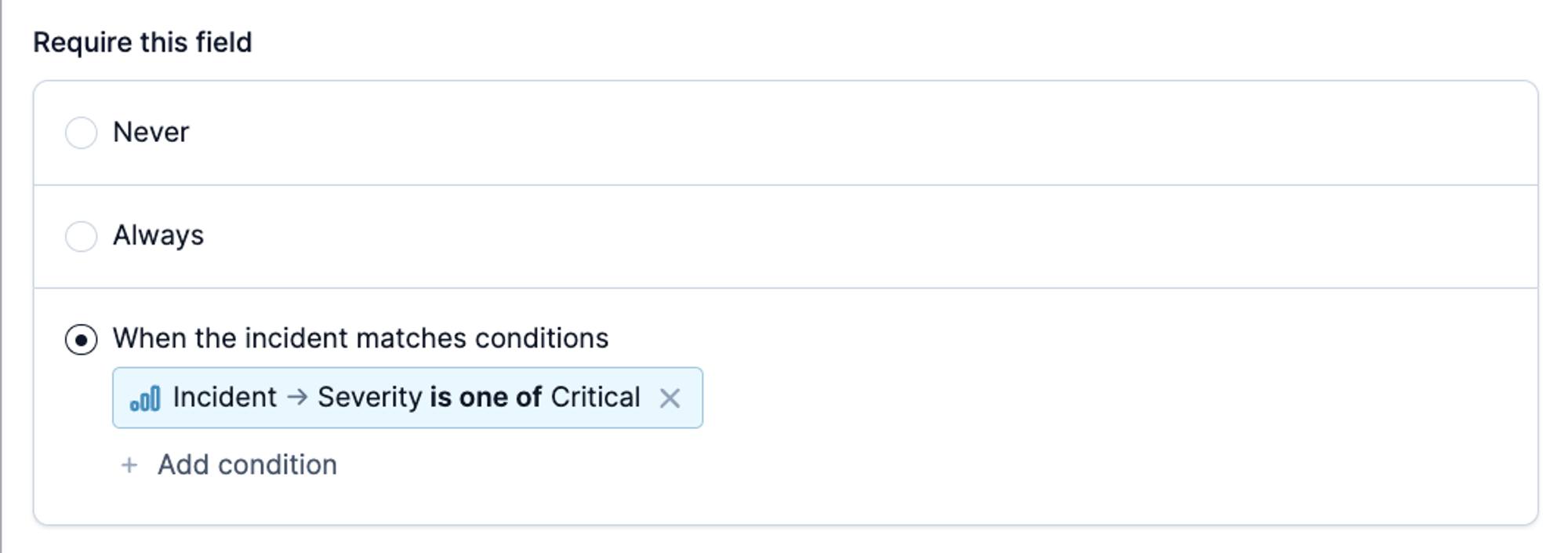 Required fields are a blessing and a curse: it’s useful to ensure that a responder fills in a field and doesn’t forget, but having lots of required fields can be very frustrating when you’re trying to fix a problem. You can now choose when you want a field to be required: for example, you might have a role as Comms Lead which is required if the severity is Critical, but not for lower severity incidents.