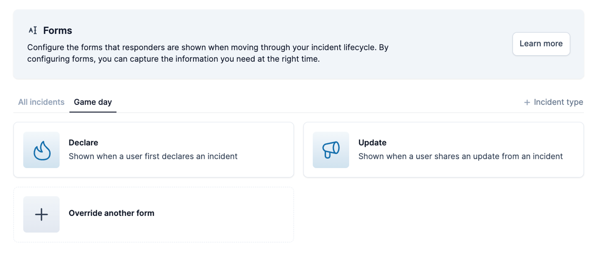 You can now control exactly which fields will show on each form, and see the impact of those changes in real time. For example, you can hide the summary field when declaring an incident unless it’s at least a Major severity. These work ‘in real time’ too, so when you change the severity from Minor to Major, the summary field will appear in your form.