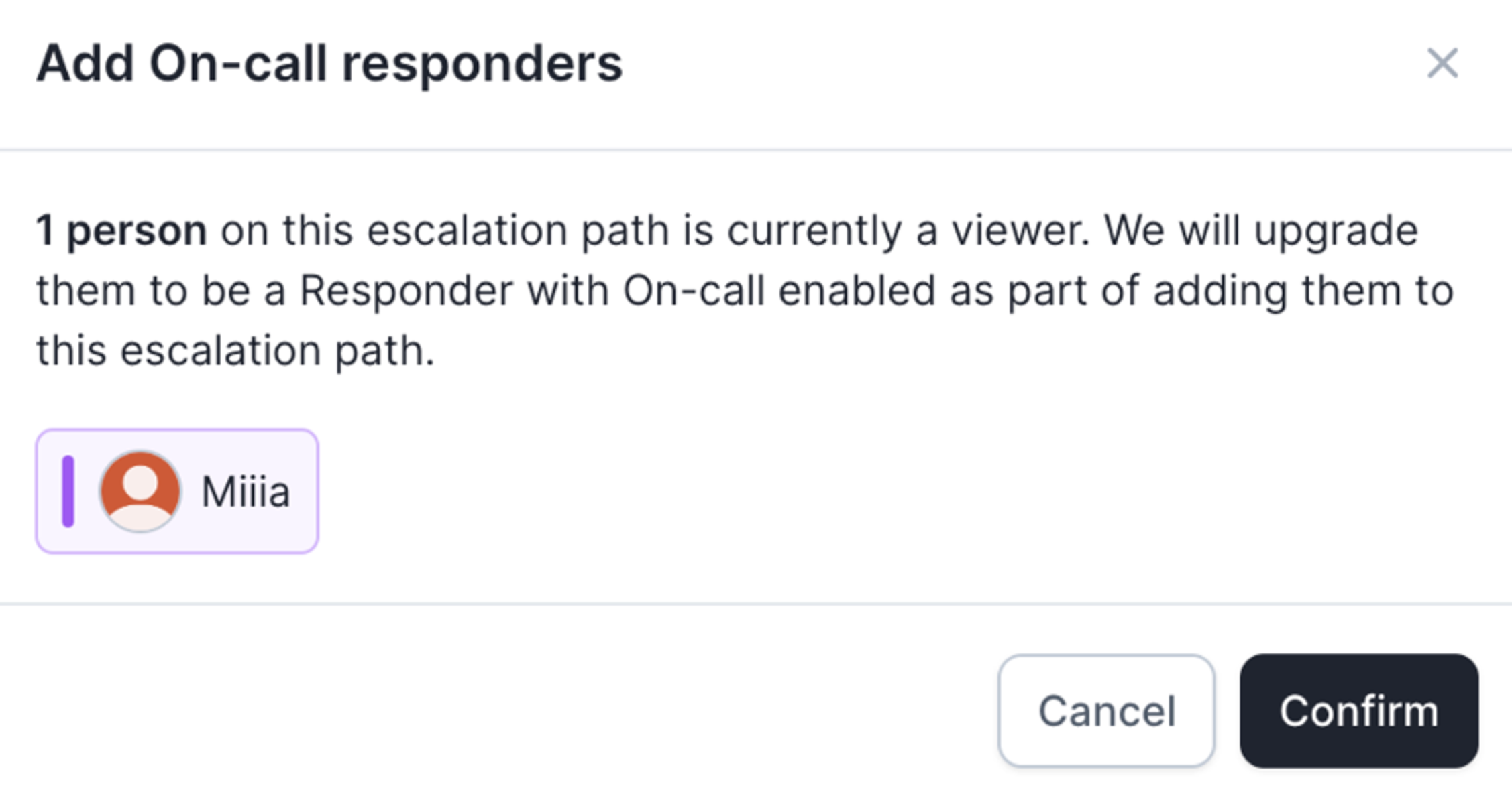 Users who take any of the Responder actions listed above will automatically be upgraded to a Responder seat. For On-call seats, you’ll see a confirmation modal when adding users who don’t have an On-call seat to a schedule or escalation path.- On the Team plan, on-call seats can be purchased like responder seats and you are free to add or remove as you wish.