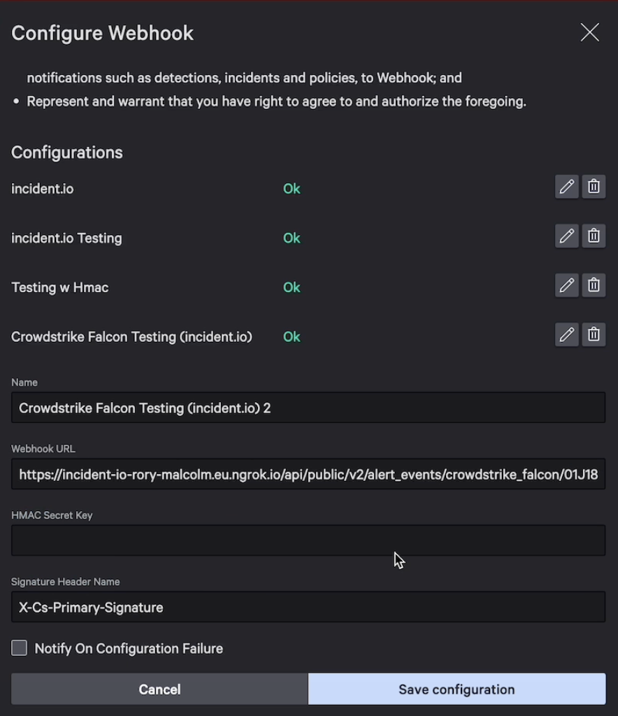 - Now you can go back to incident.io and copy and paste the Name, Webhook URL, HMAC Secret key and Signature Header Name to the Crowdstrike Falcon modal.
