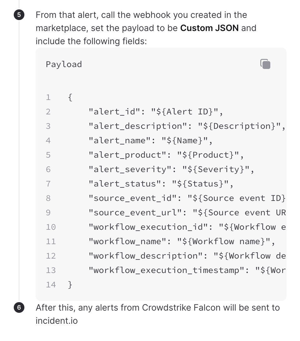 Customers can seamlessly connect Falcon with incident.io to import crucial information. When an alert comes through Falcon, it enables incident.io to page the right person based on the customer’s configuration, provide detailed information about the alert, and gather the necessary team members in the incident channel to collaborate on resolving the incident. Additionally, incident.io can automatically create incidents from alert sources and filter and group them according to the customer’s preferences. This article provides step by step instructions for setting up Crowdstrike Falcon as an alert source within incident.io.Instructions