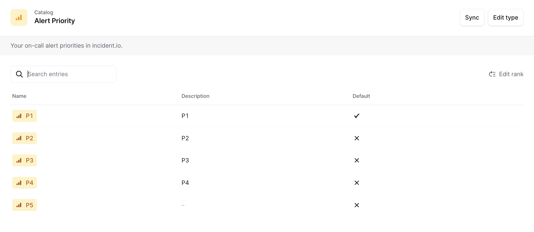 Catalog is the engine that powers automation and expressions in incident.io. It allows you to sync or create your organisation structure like teams and services and then connecting them into other incident.io native types like escalation paths, schedules and priorities. Just head to Catalog > Alert Priority and you’ll be able to see all Priorities that you have created earlier in the Priorities -tab .