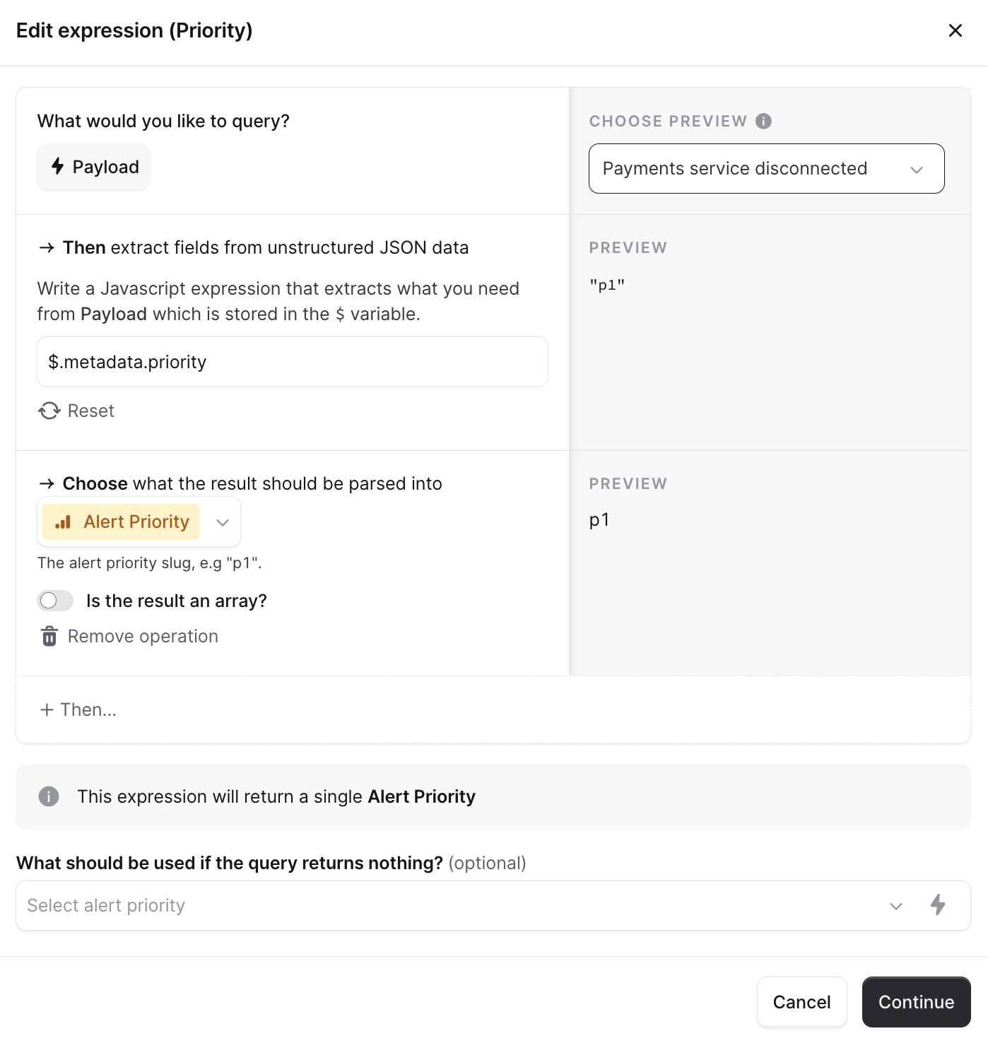 - Then write Javascript expression to extract what you need. In this simple case that is $.metadata.priority. Now you should see the example of the preview