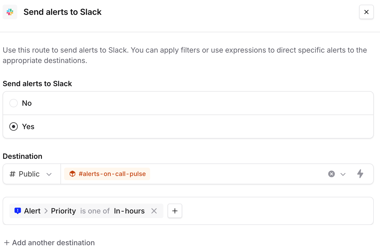 You can choose to enable sending alerts to Slack from an alert route. Once enabled, you’ll be able to select private or public channels to send your alerts to.Filtering the alerts you send to Slack