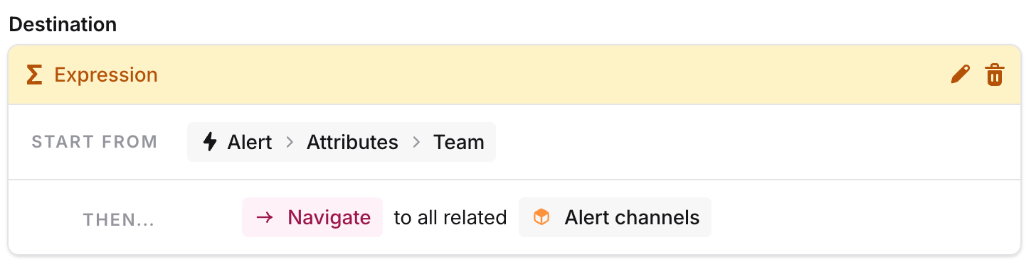 Using expressions and the Catalog, you can choose to send alerts to different Slack channels according to alert attributes. For example, if you are have aTeam alert attribute, and your Team has a Slack Channel attribute, you’ll be able to dynamically pick where to send your alerts: