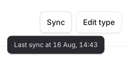 We keep lots of data sources in-sync with a scheduled automatic sync. Typically this runs every three hours and doesn’t require any input from you. In the dashboard, when you open a specific Catalog type, you’ll see a button calledSync . If you hover, we’ll tell you when the type was last synced.