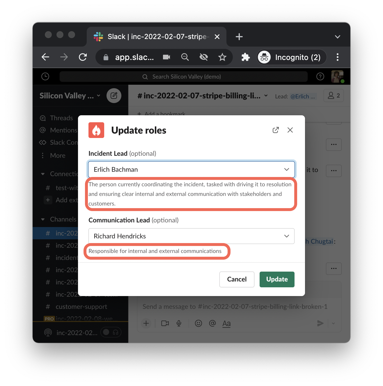 Set the Slack command that will assign this role. For example, /inc role lead @dinesh sets [Dinesh] as the [Lead]. The Communication Lead’s could be comms , such that /inc role comms @Erlich assigns Erlich to the Communication Lead role.
