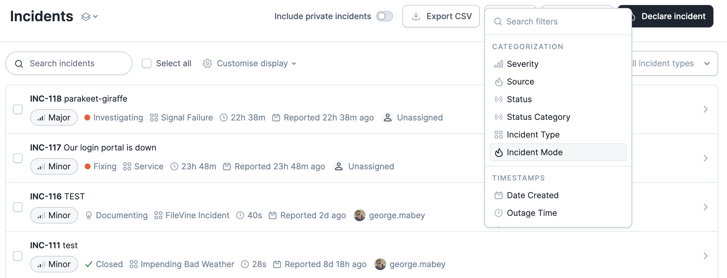 To keep things tidy, we only show your real incidents by default within the incidents section of the dashboard. To view a list of incidents in any other mode, you can simply filter by incident mode wherever appropriate: