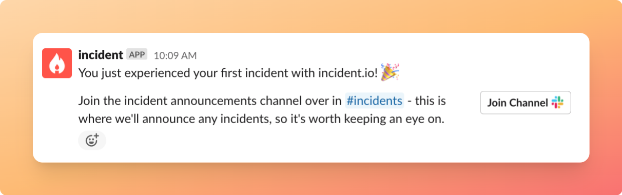 Once you’ve declared an incident, we’ll create a dedicated #inc-… channel for it. From there, you can invite your team of responders by simply adding them to that incident’s Slack channel. They’ll receive a message to help them get going and follow our tutorial