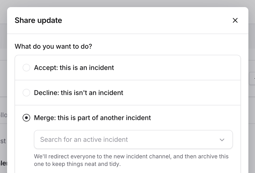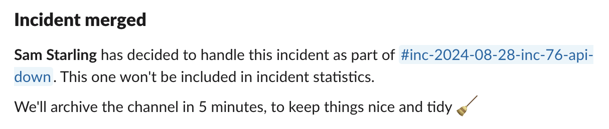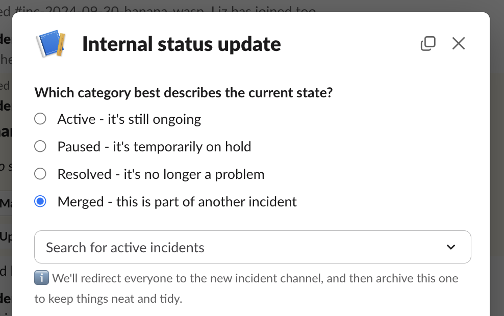 You can merge an active incident when doing an incident update (as above), or by using the/inc merge Slack command.