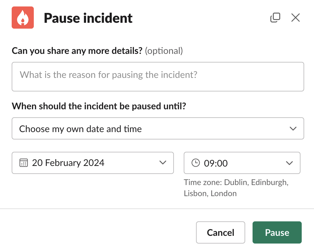 The/inc pause command allows you to pause an incident, setting the date & time it should be paused until, and a message explaining why it’s been paused.