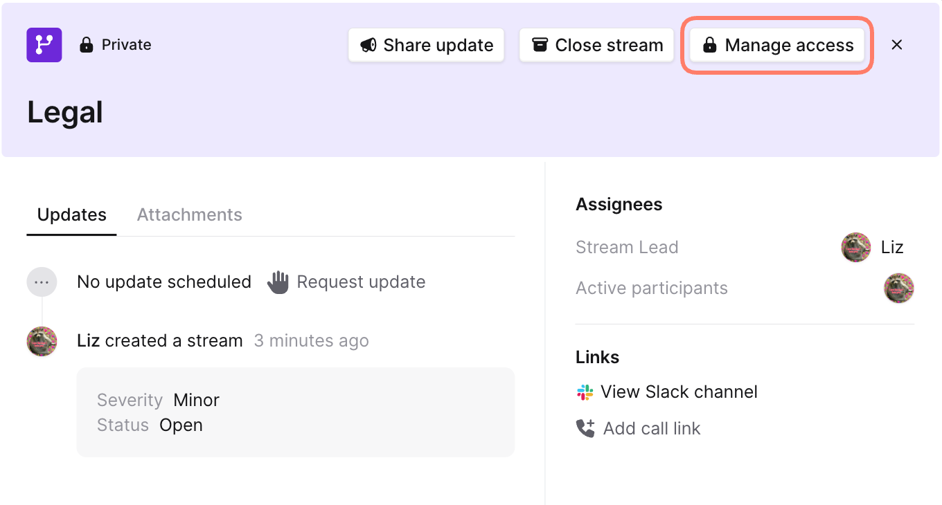 To create a private stream, simply use the usual/incident stream Slack Command (or create a new stream through the dashboard).