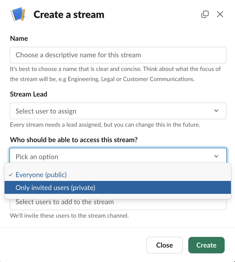 We will add a drop-down labelled ’ Who should be able to access this stream? ’. To make the stream private, select ’ Only invited users (private) ’.