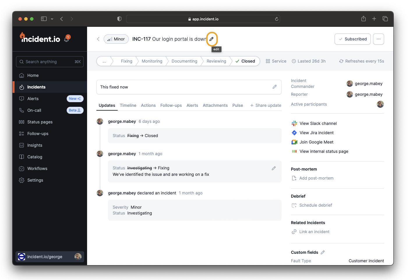 To rename an incident from the Incident Homepage, open the menu in the top right and click “Rename incident”.