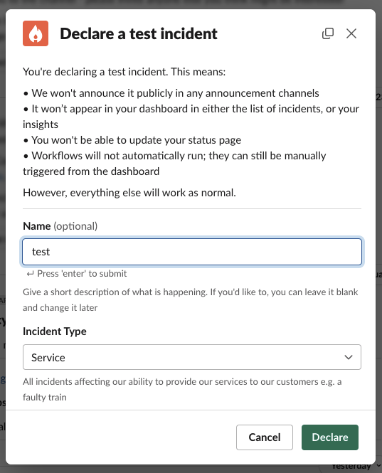 Test incidents are almost exactly the same as normal incidents: you can set summaries, leads, escalate to others, create workflows , and receive nudges. The only differences are:- We won’t announce it publicly in any announcement channels