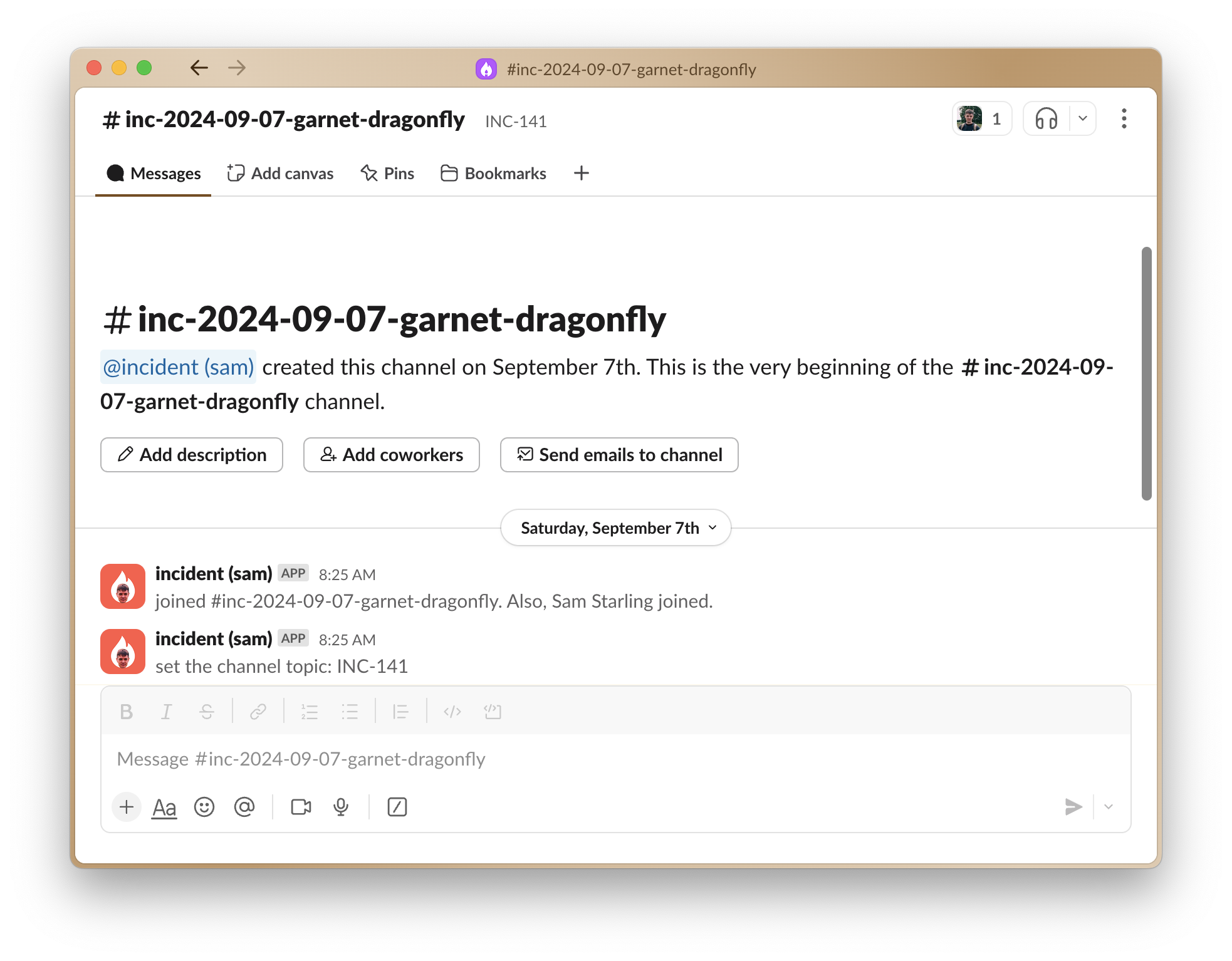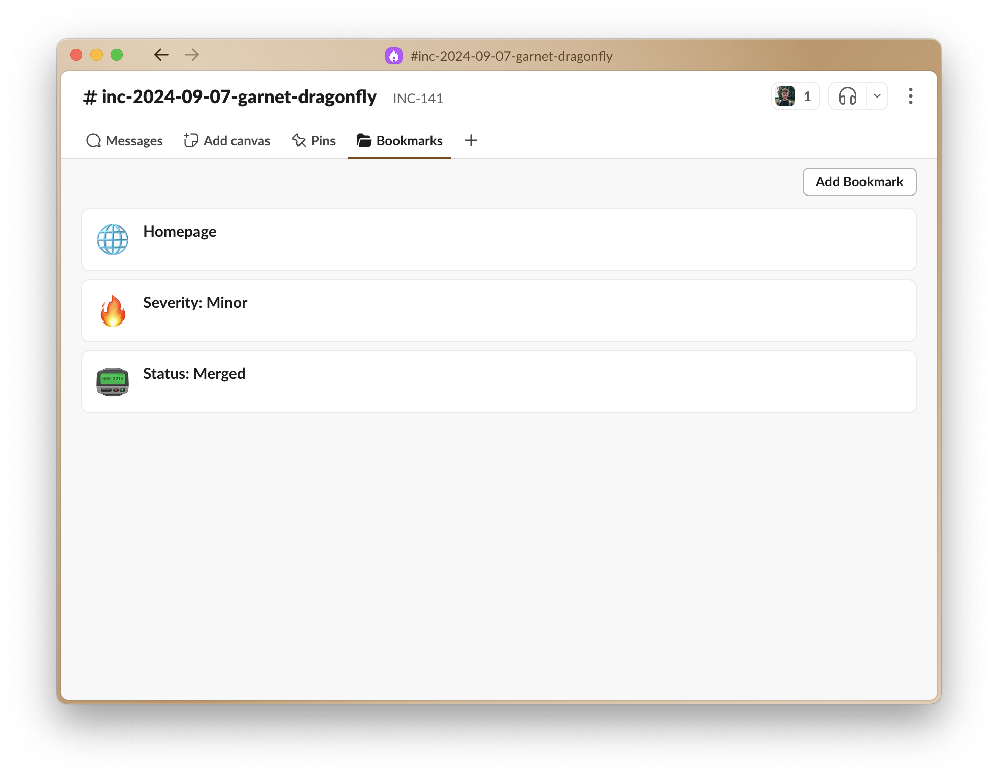 Everything that was previously in the top bar will now be in a “Bookmarks” folder, and your incident channel will now look like this: