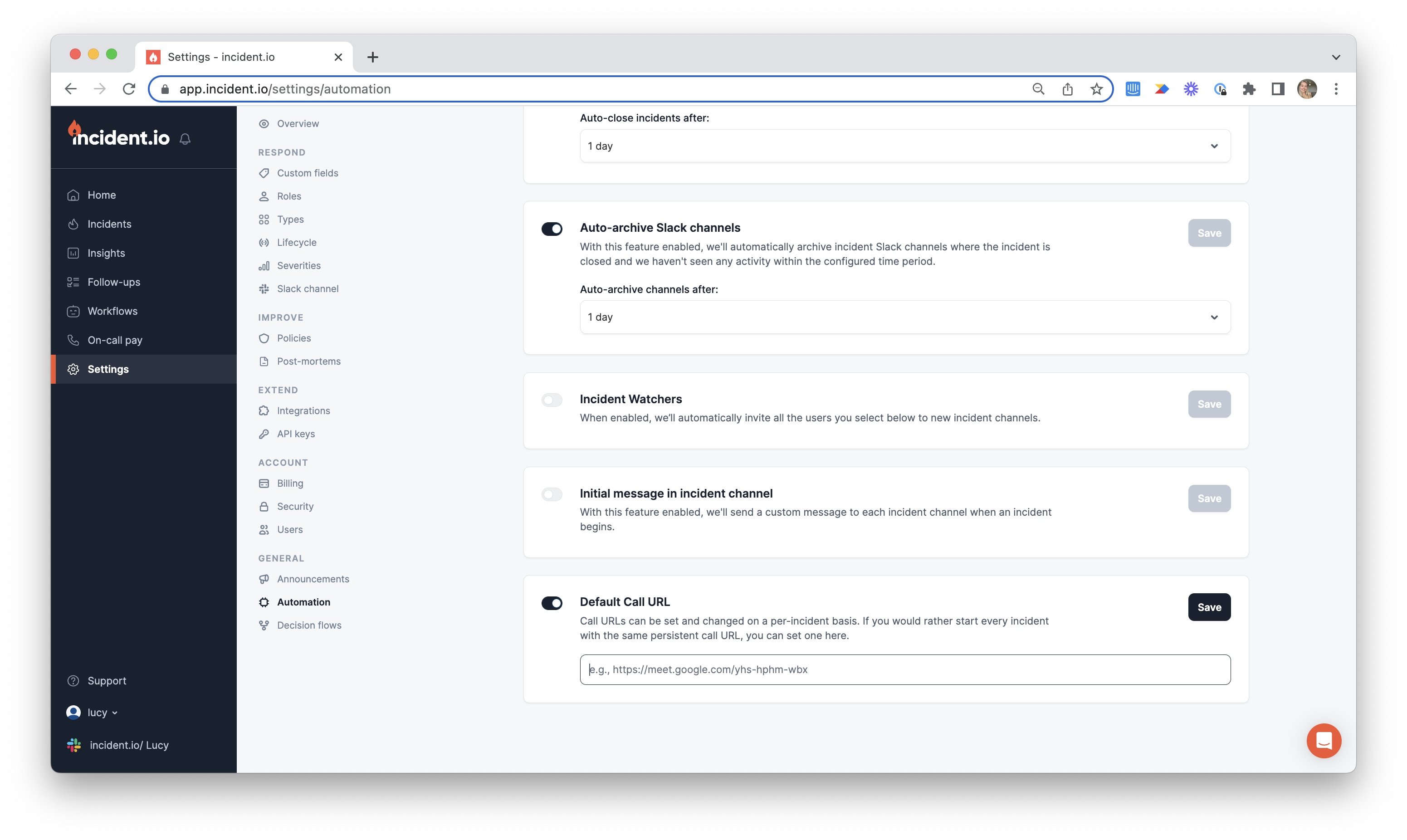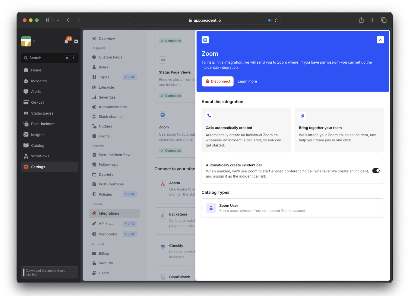 We can automatically generate and pin a dedicated call link for each new incident via the Zoom or Google Meet integration. Once you’ve set up Zoom or Google Meet , toggle on theAutomatically Create Incident Call setting in the Zoom or Google integration.