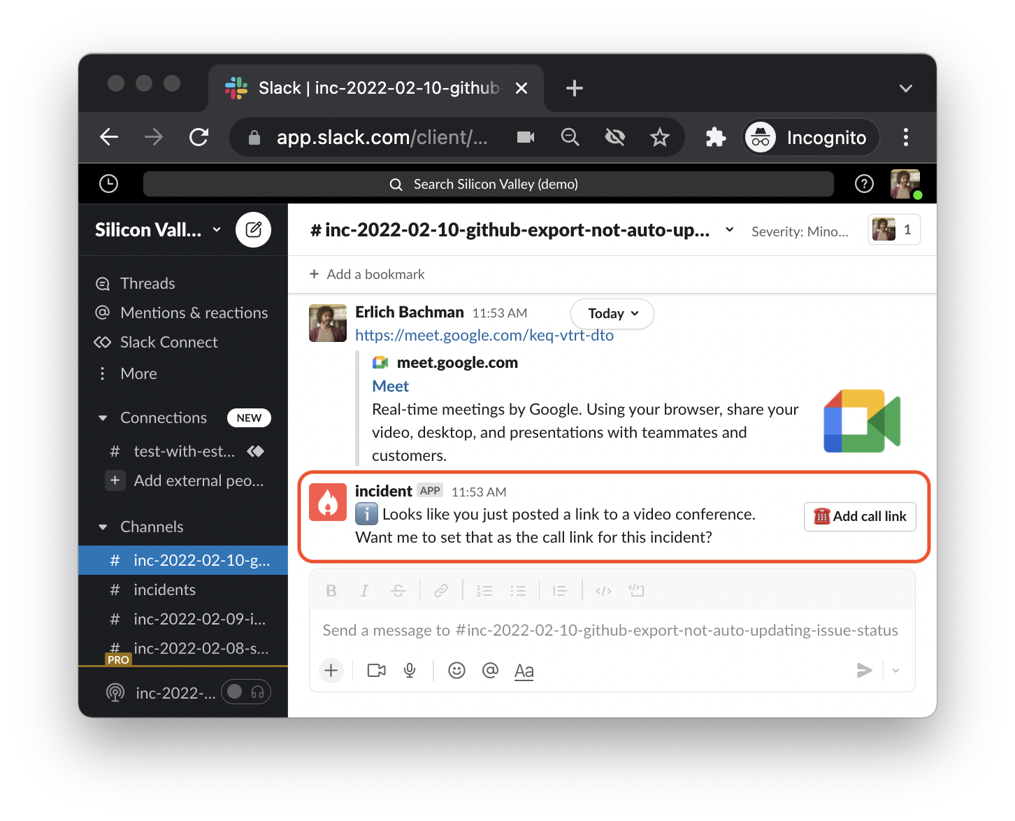 We will recognise it as a call link, and ask you if you’d like to pin it as the go-to link for everyone working on the incident.
