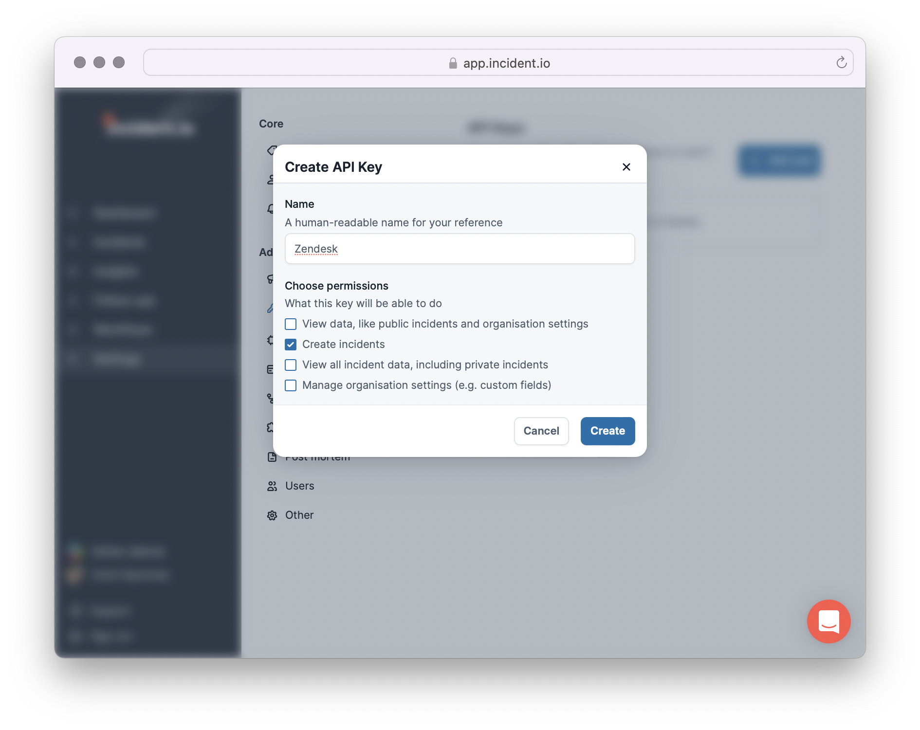 You can create your API Keys from the API section of your incident.io Settings if you are on a Pro or Enterprise plan.Example use case: declaring an incident from Zendesk