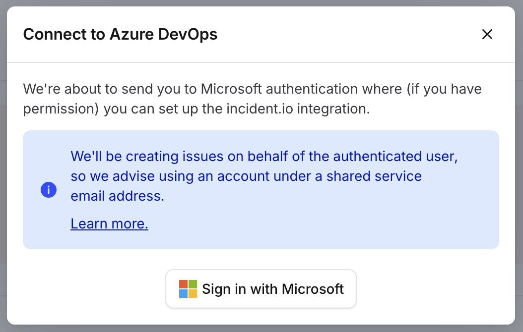 First, you’ll need to enable the integration. Ensure you are logged in as an Azure DevOps user with access to the relevant projects. Navigate to Settings > Integrations, locate Azure DevOps via the search bar, and click “Connect”. A modal will appear. Click “Sign in with Microsoft” to be redirected to Microsoft for the authorisation flow.