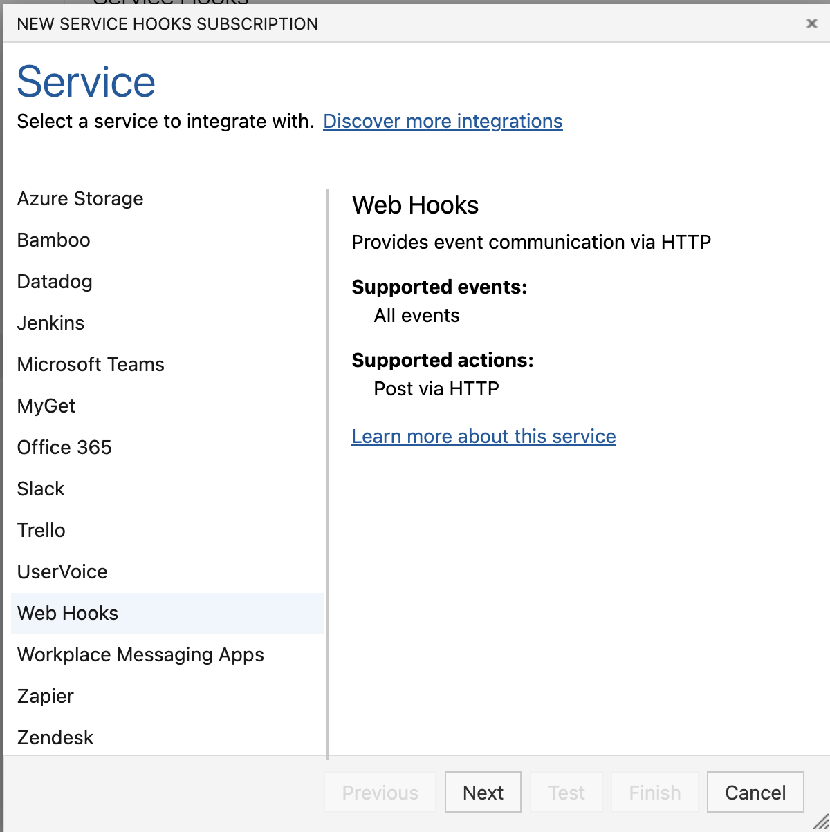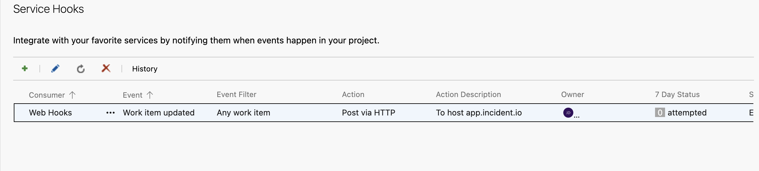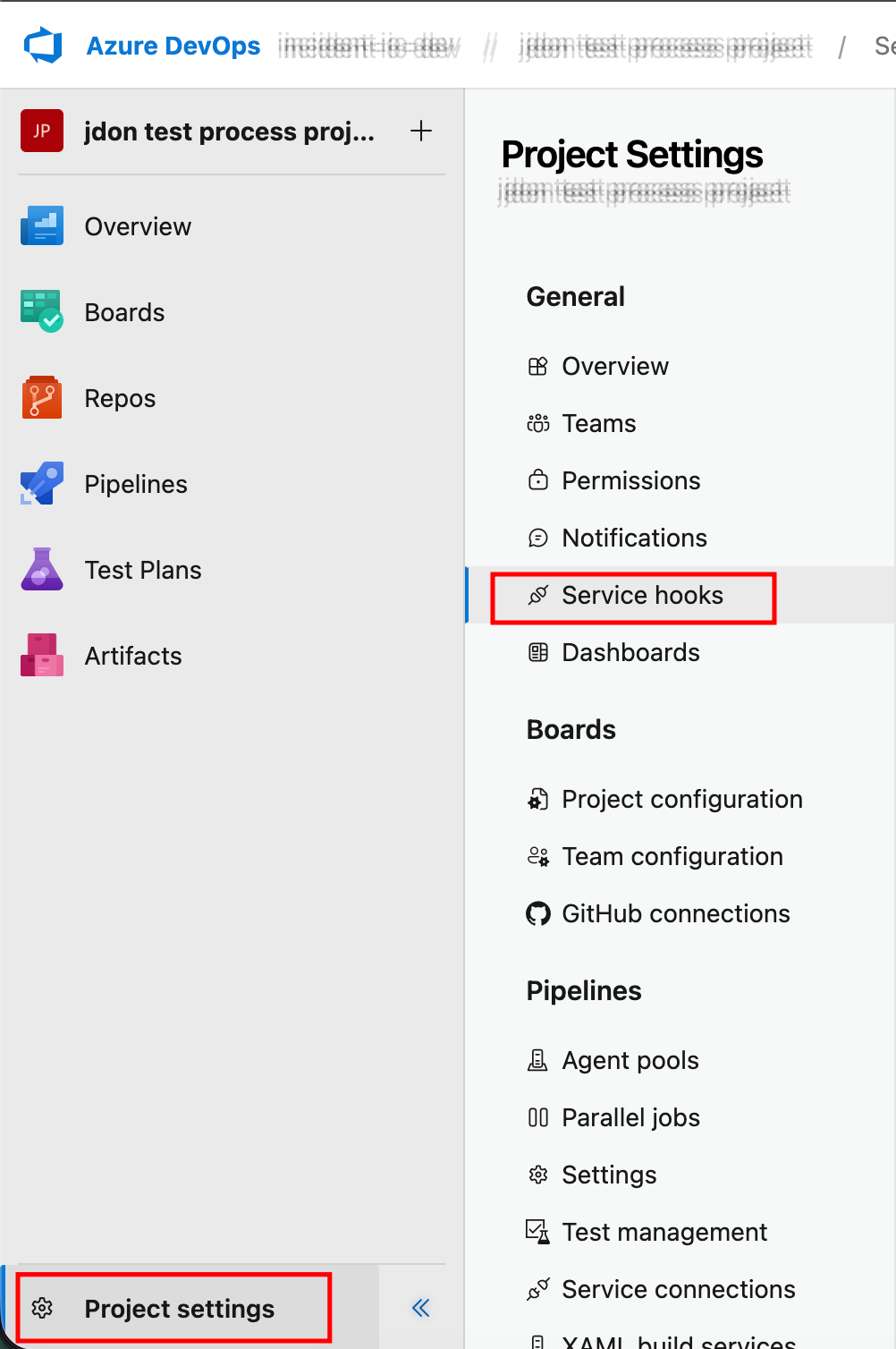 - Go to your project, select Project settings, and then select Service hooks.