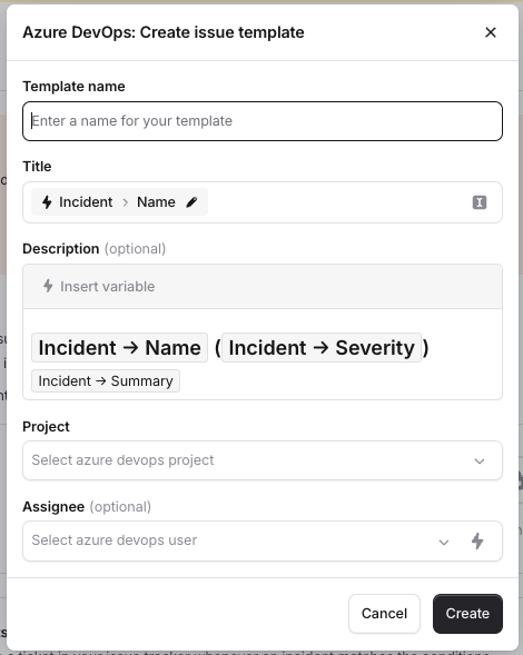 Next, we need to define what the contents of each issue should be. Navigate to Settings > Incident Tickets, and click ”+ Add a new template” The issue template determines which project the issue will be created in, and who it should be assigned to. It also allows for customisation of the issue title and description, using variables and custom fields on the incident.