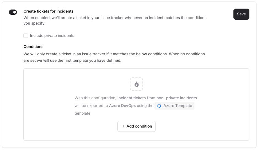 Once your template has been configured, use the toggle to ‘Create tickets for incidents’.