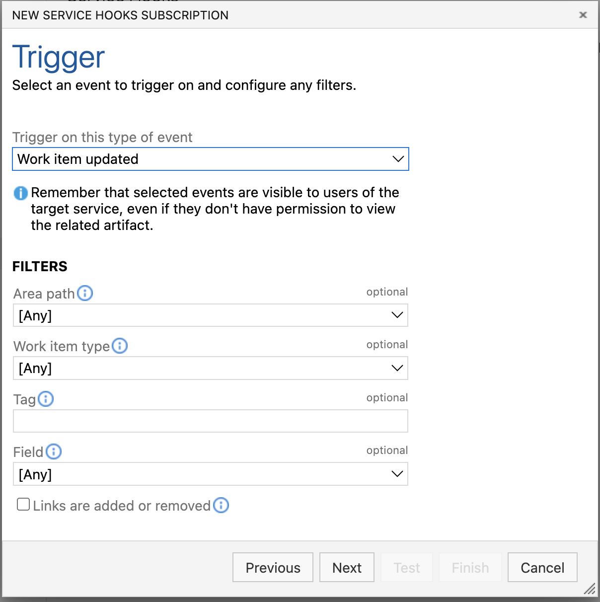 - Change the trigger to be Work item updated and then click next