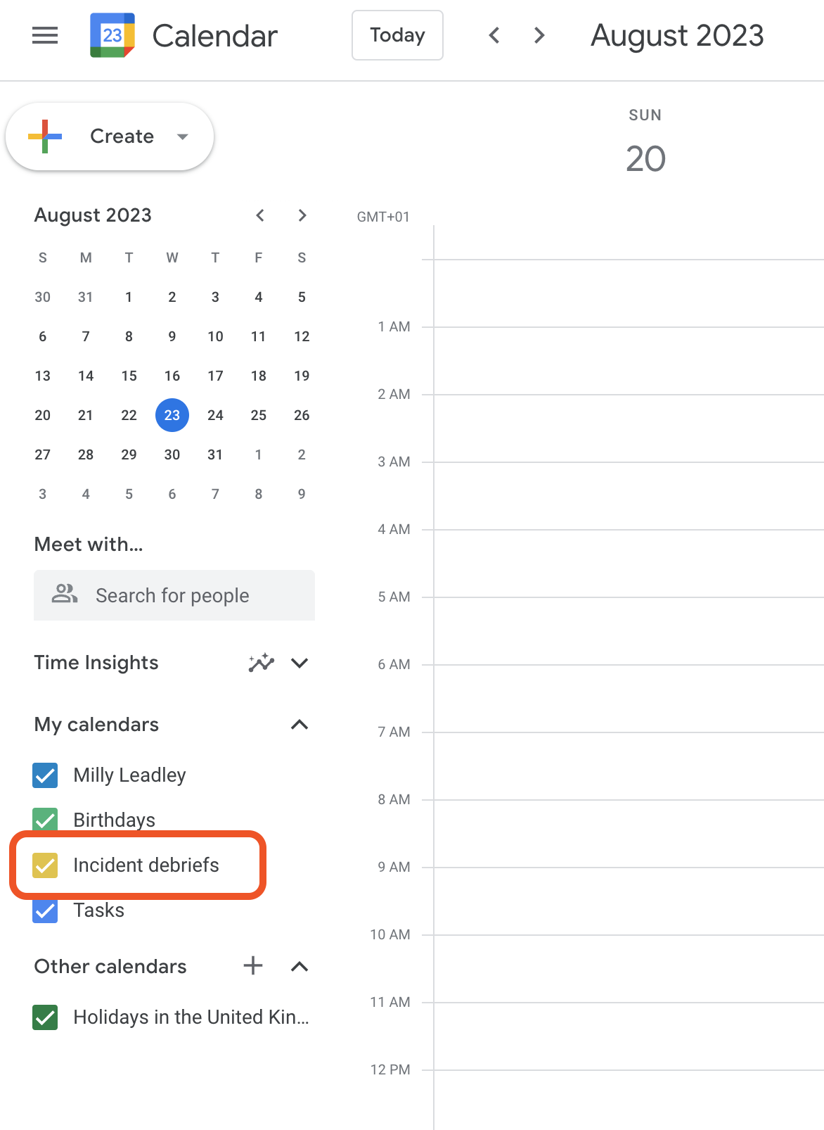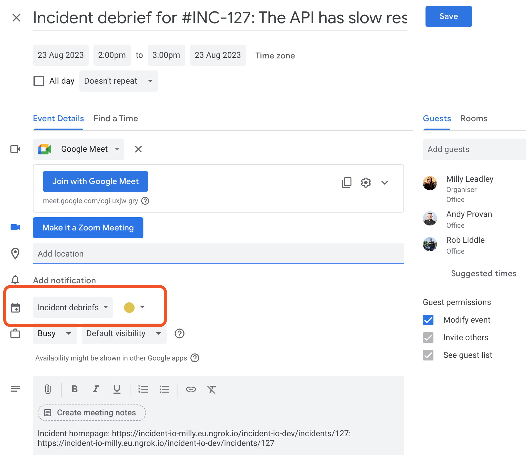 When you’re successfully set up, you should be able to schedule an event within a specific shared calendar, such asIncident debriefs :
