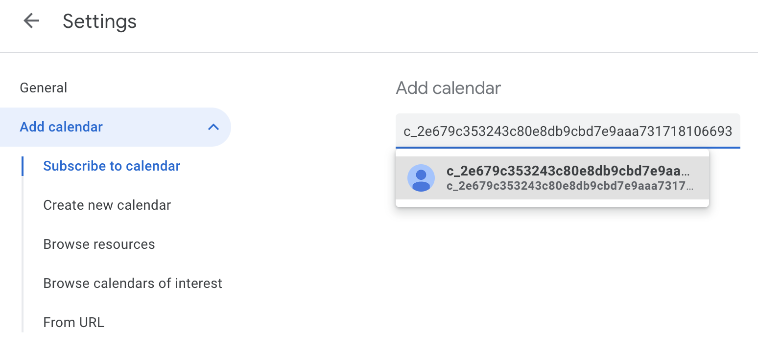 + next to Other calendars and choose Subscribe to calendar . Paste the calendar ID here.