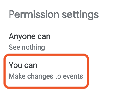 Click the three dots next to the specific calendar and chooseSettings . You’ll have the correct permission if it says you can Make changes to events . If you see something else, you’ll need to ask the calendar owner to grant permission to you (or more helpfully, your whole user group) - instructions are here .