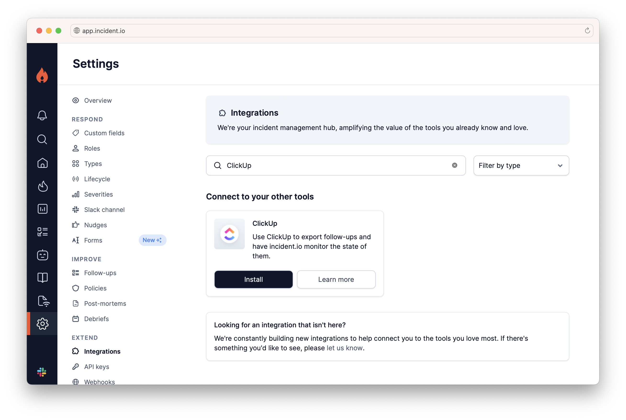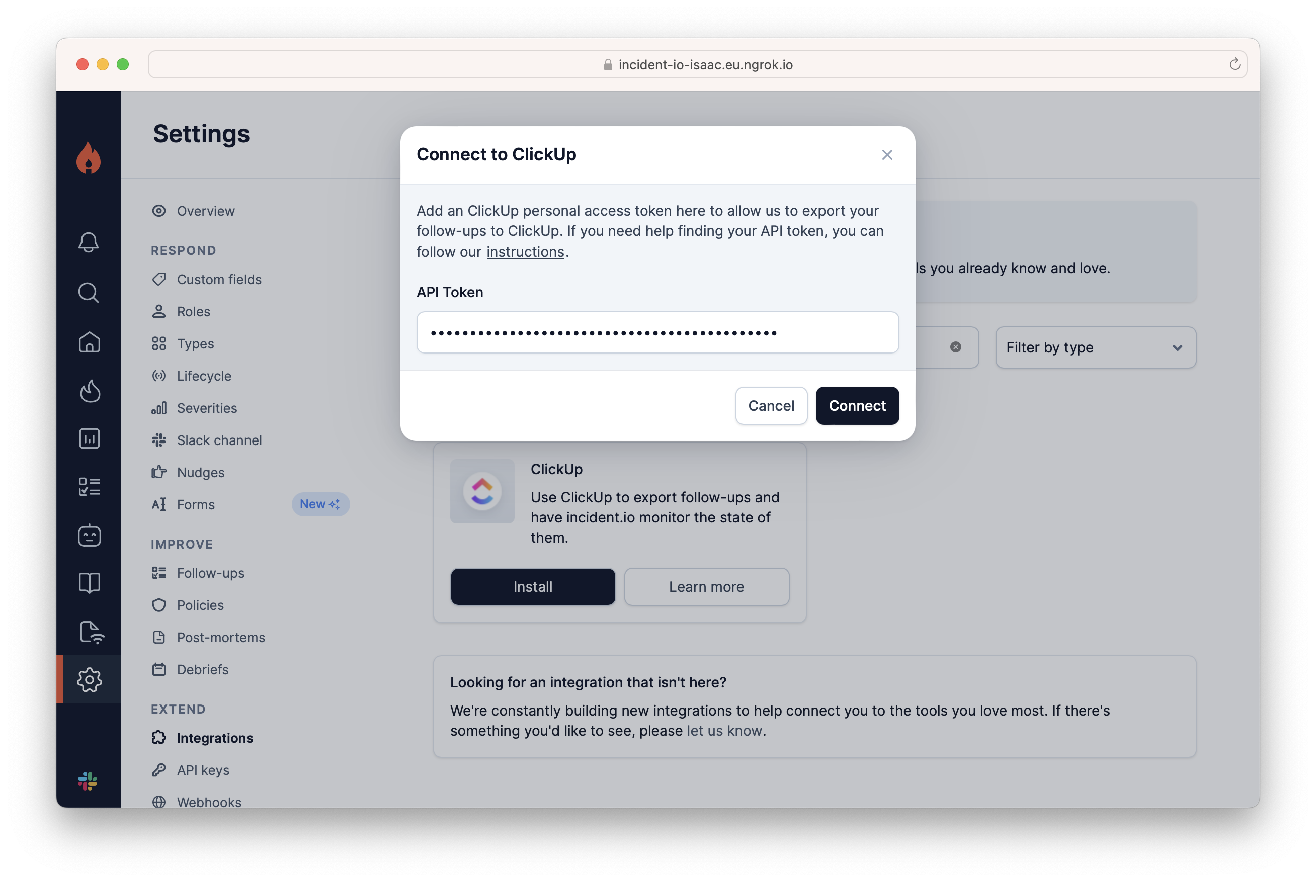 Our current integration is a fairly simple setup for now. In its present state, the integration lets you:- Export your incident follow-ups to ClickUp; and