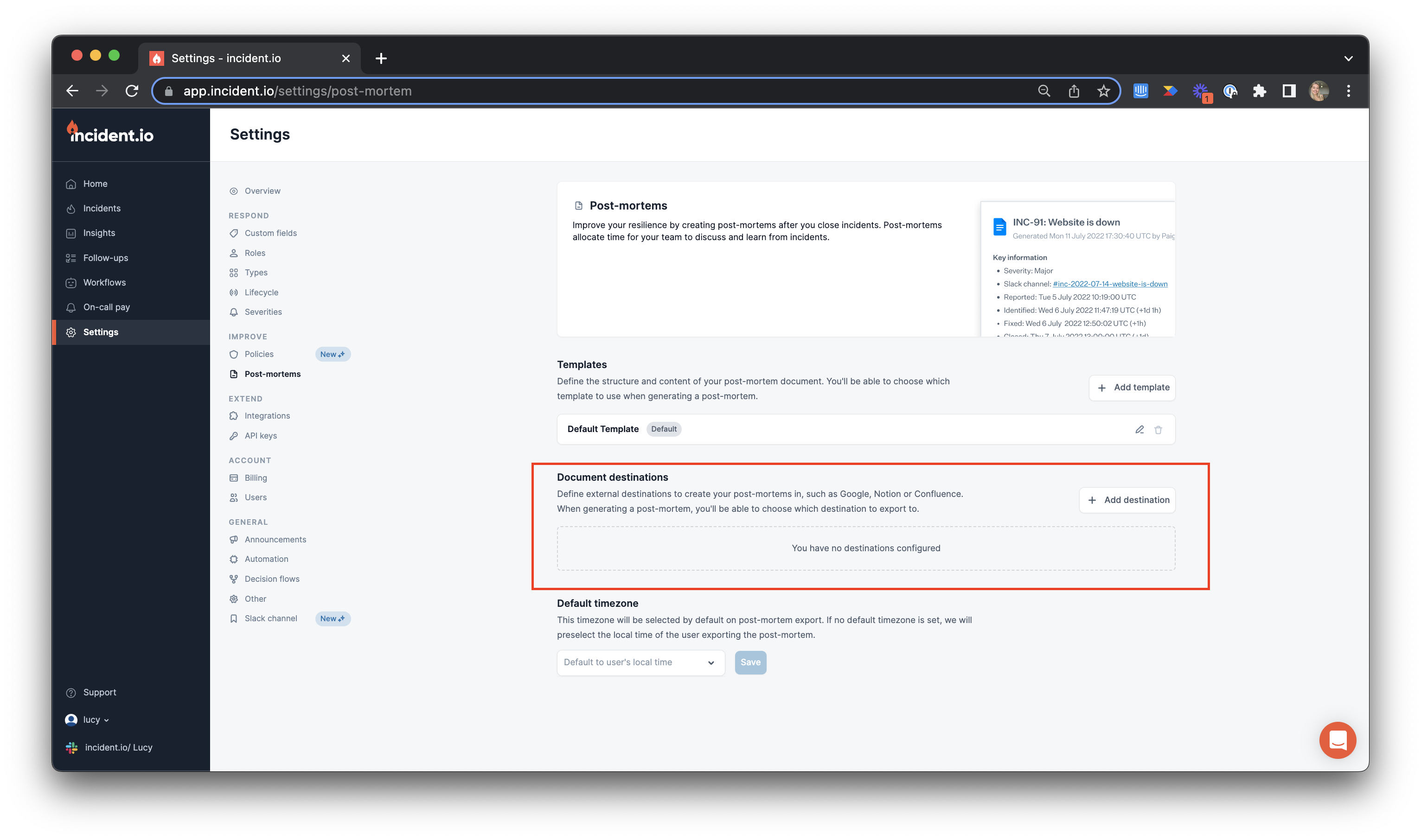 Within the Post-Mortem setting tab, add Confluence as your document destination by clicking ‘Add destination’.