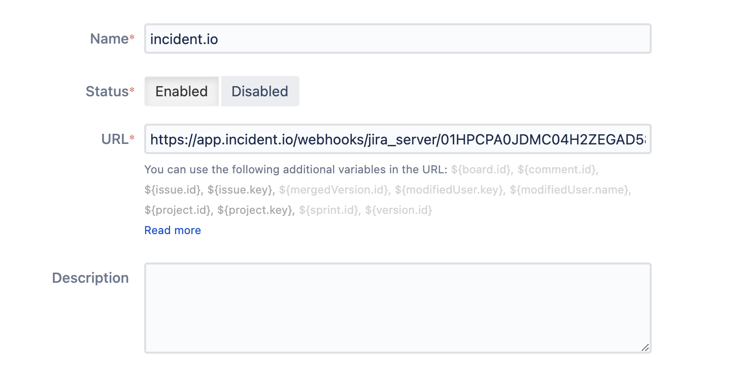 Name : ‘incident.io’ Status : Enabled URL : Check Settings → Integrations → Jira Server to find your webhook URL Description : Leave blank