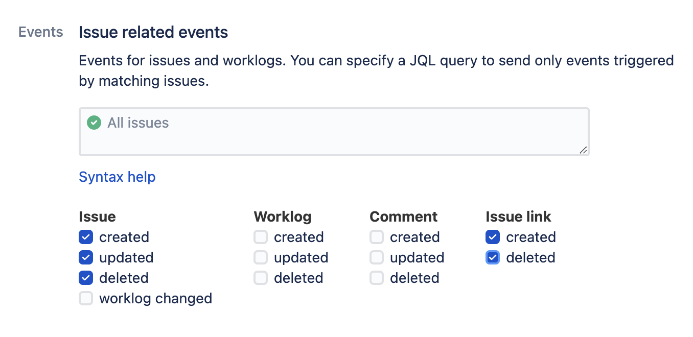 Under ‘Issue related events’, check ‘issue created’, ‘issue updated’, ‘issue deleted’, ‘issue link created’ and ‘issue link deleted’. All other events can be left disabled.