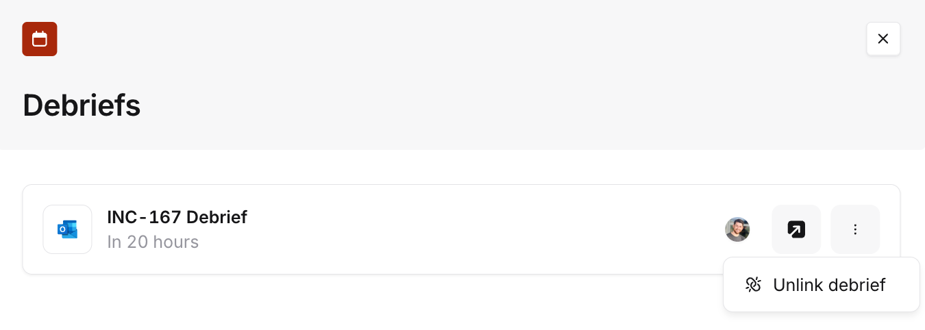 If we automatically attach a debrief which should not be linked to your incident, you can unlink it by heading to the sidebar on the incident details page, clicking the debrief, and then clicking ”…” > “Unlink debrief”: