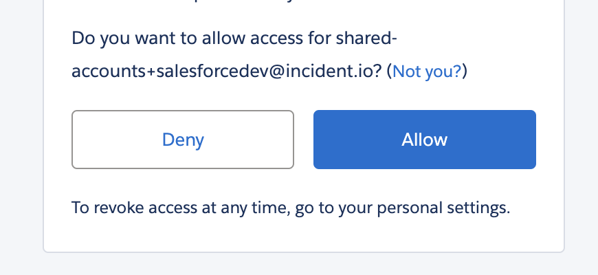 Connect and you’ll be redirected to Salesforce, where you can login as the user you’d like to connect with — or, if you’re already logged in, you’ll see a modal prompting you to authorise incident.io to access a variety of scopes within Salesforce.