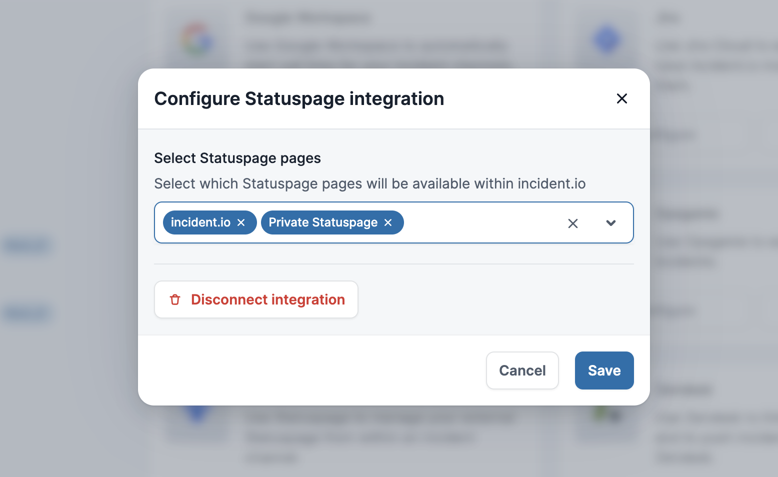 You can add Statuspage to incident.io in just a few clicks.1. Go to Settings > Integrations