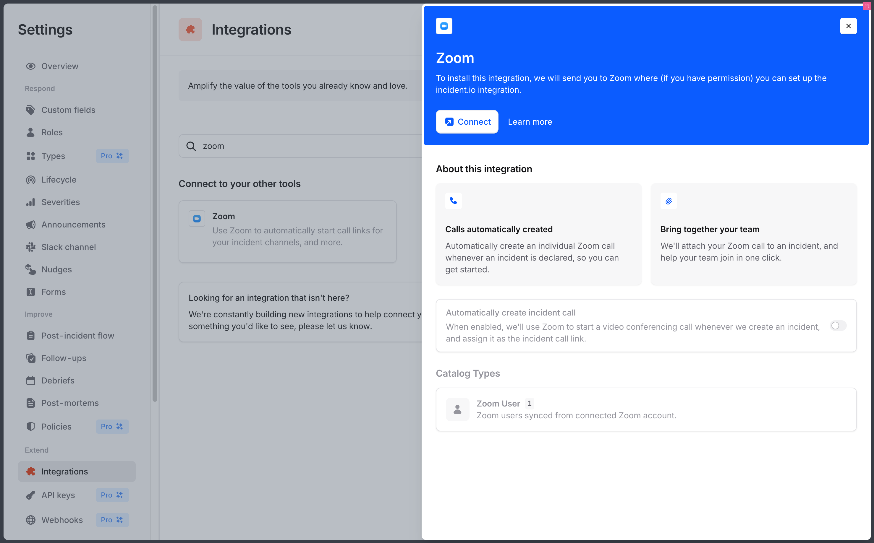 You can add Zoom to incident.io and configure auto create in just a few clicks.1. Go to Settings → Integrations