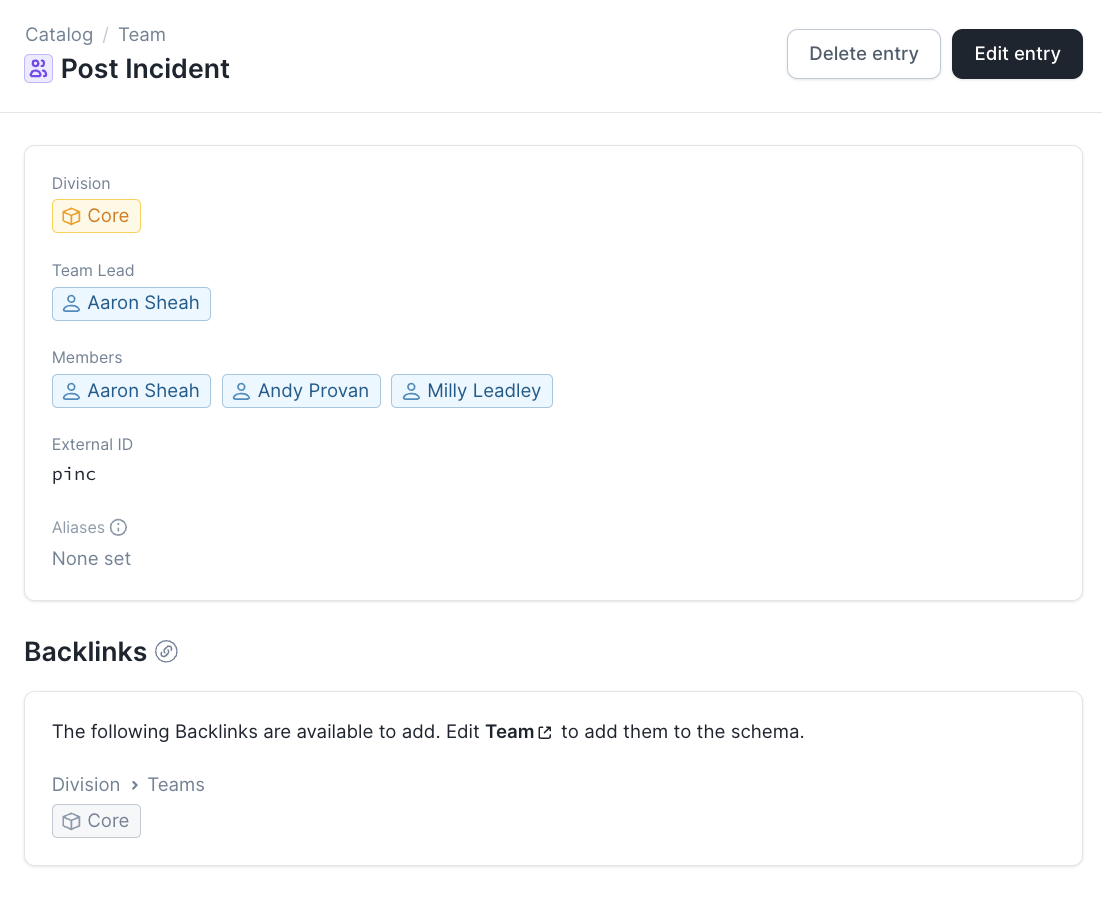 - A Catalog type Team that has Members, a Manager, and a Tech Lead