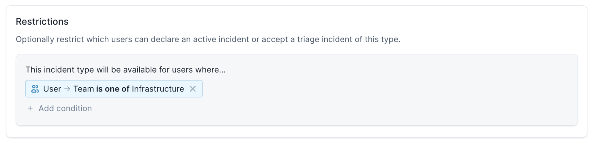 You can now restrict an incident type by rule - here, we’re saying that only users in the Infrastructure team can accept security incidents.