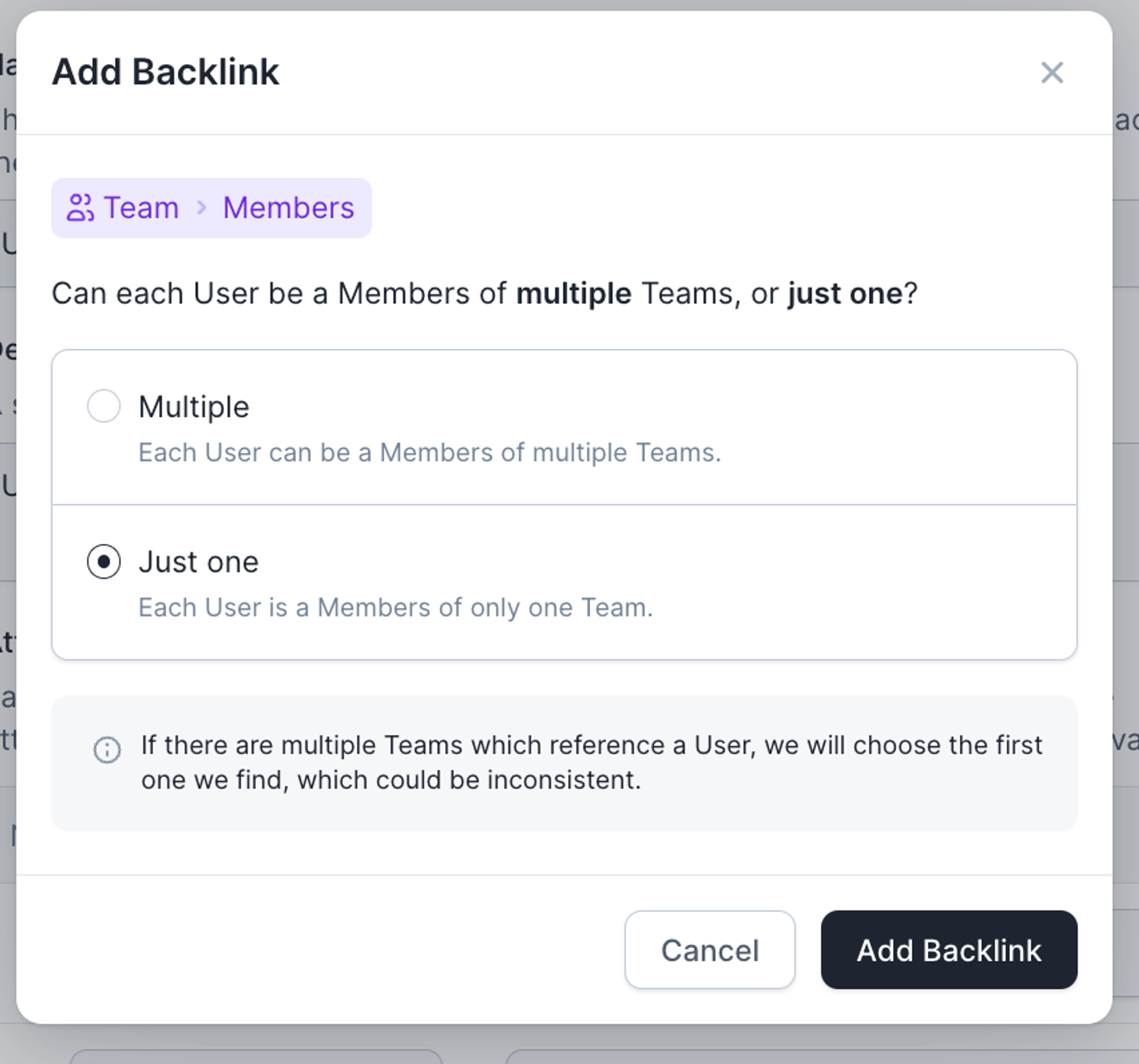 To unlock the real power of Teams, you’ll want to be able to navigate from a User to the Team they’re in, across incident.io features like Forms, Workflows, and more. To do this, we need to create a Backlink .More details about BacklinksIn almost all cases you’ll configure your Teams in Catalog by adding “Members” to the “Team” catalog type. Why? It’s much quicker to open a specific Team, and then add all Members of that team in a single dropdown select, rather than going through every person in your organisation, and adding the Team which they’re in. It’s just quicker & easier to start with Teams!So, in most cases, you’ve associated Teams → Users, but you’re missing the “Backlink” from Users → Teams. It would be a lot of wasted effort to have to also go through all Users and re-pick their Team (e.g. Alice is in Team A, Bob is in Team B). Instead, you simply want to leverage the pre-existing connection (that you’ve already built) between Teams → Users, but in the other direction: Users → Teams. This is what Backlinks do!