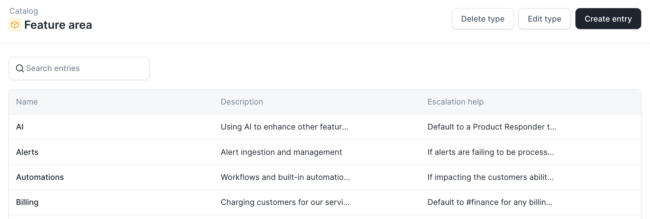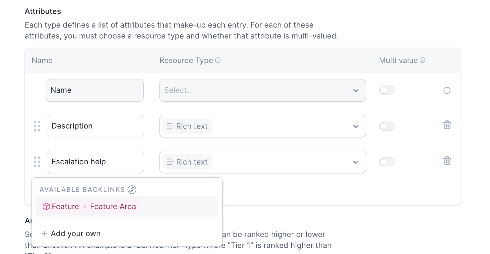 Just to cement what we’ve done in this guide, here’s another example… Let’s assume you have a Features catalog type, and a Feature Areas catalog type (e.g. the higher-level category that a set of features are part of). When setting up Catalog, you map all Features to a Feature Area. It would be extremely repetitive, difficult to maintain, if you then needed to also map all Feature Areas to Features. This means your Feature Area catalog type ends up looking like this (note: the lack of “link” back to Features):