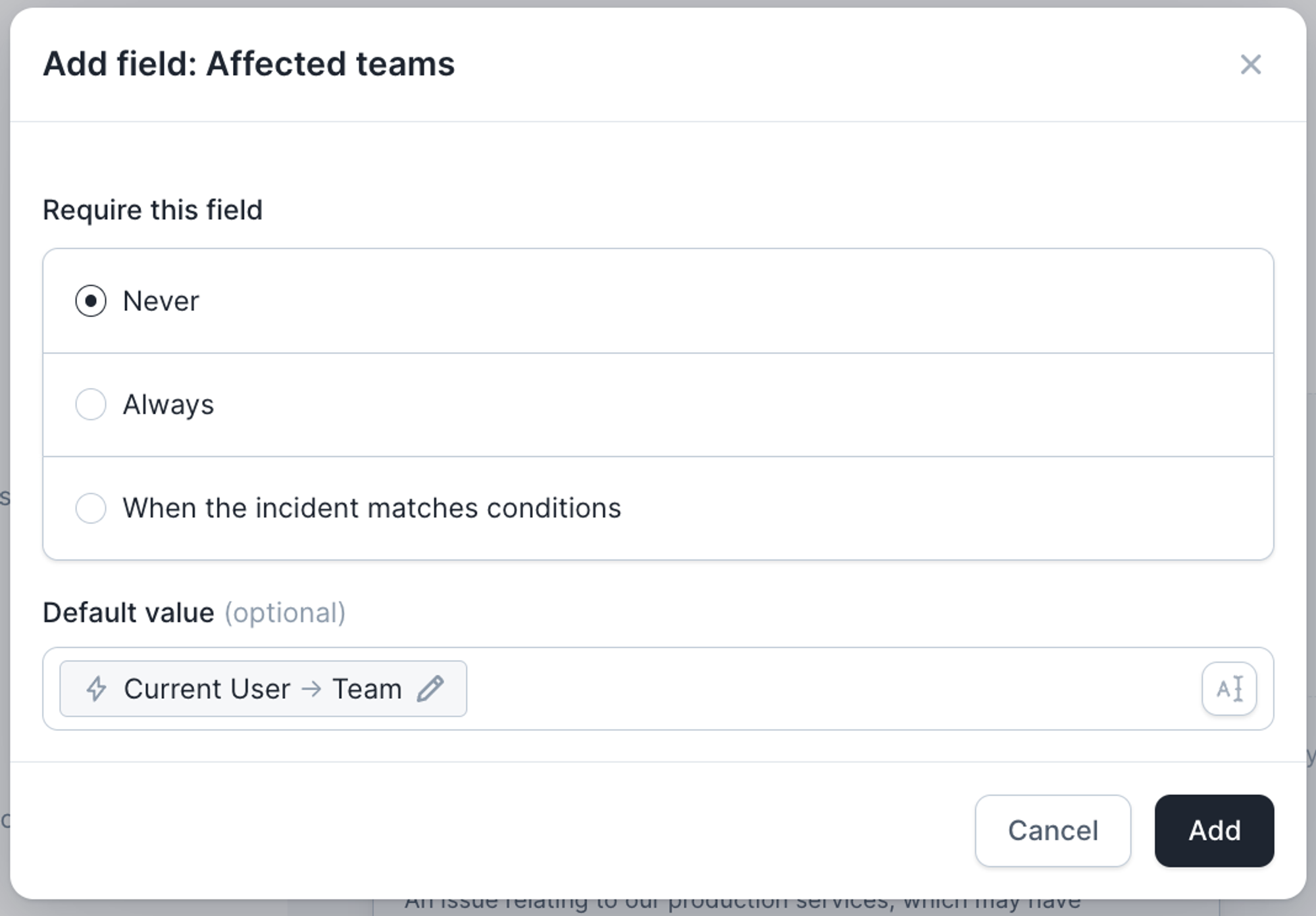 - Show or require different information when a user is declaring an incident, depending on what team they’re in