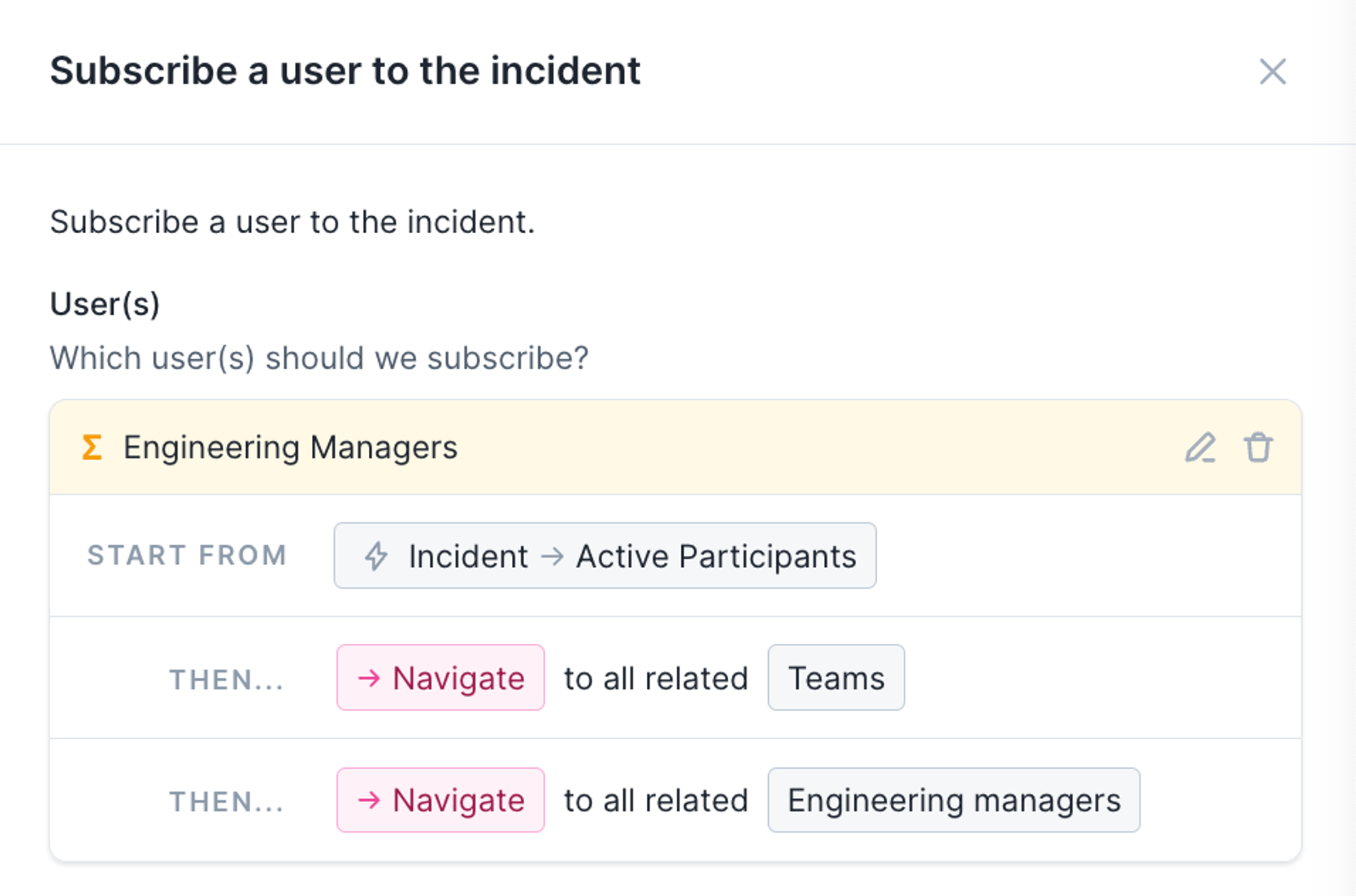 You can now use a user’s team to build out workflows. In this example, we’ll auto-subscribe Engineering Managers to every incident that someone in their team is participating in. This helps keep managers aware of where members of their team might be unexpectedly spending time, and who might need support.