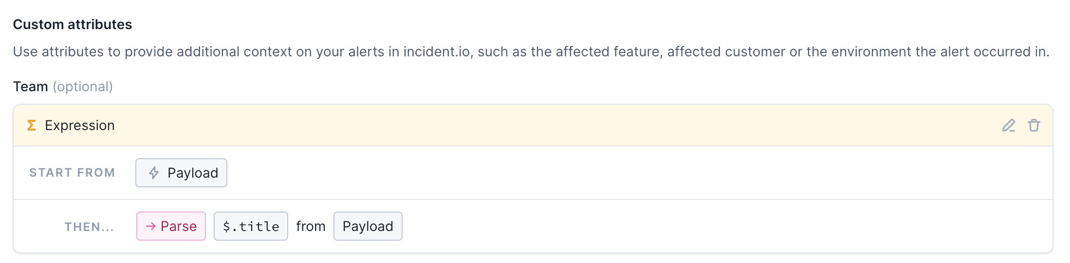 - We’re going to create a custom attribute for the Team associated with this alert, which we’re going to parse from the title attribute of the alert payload.