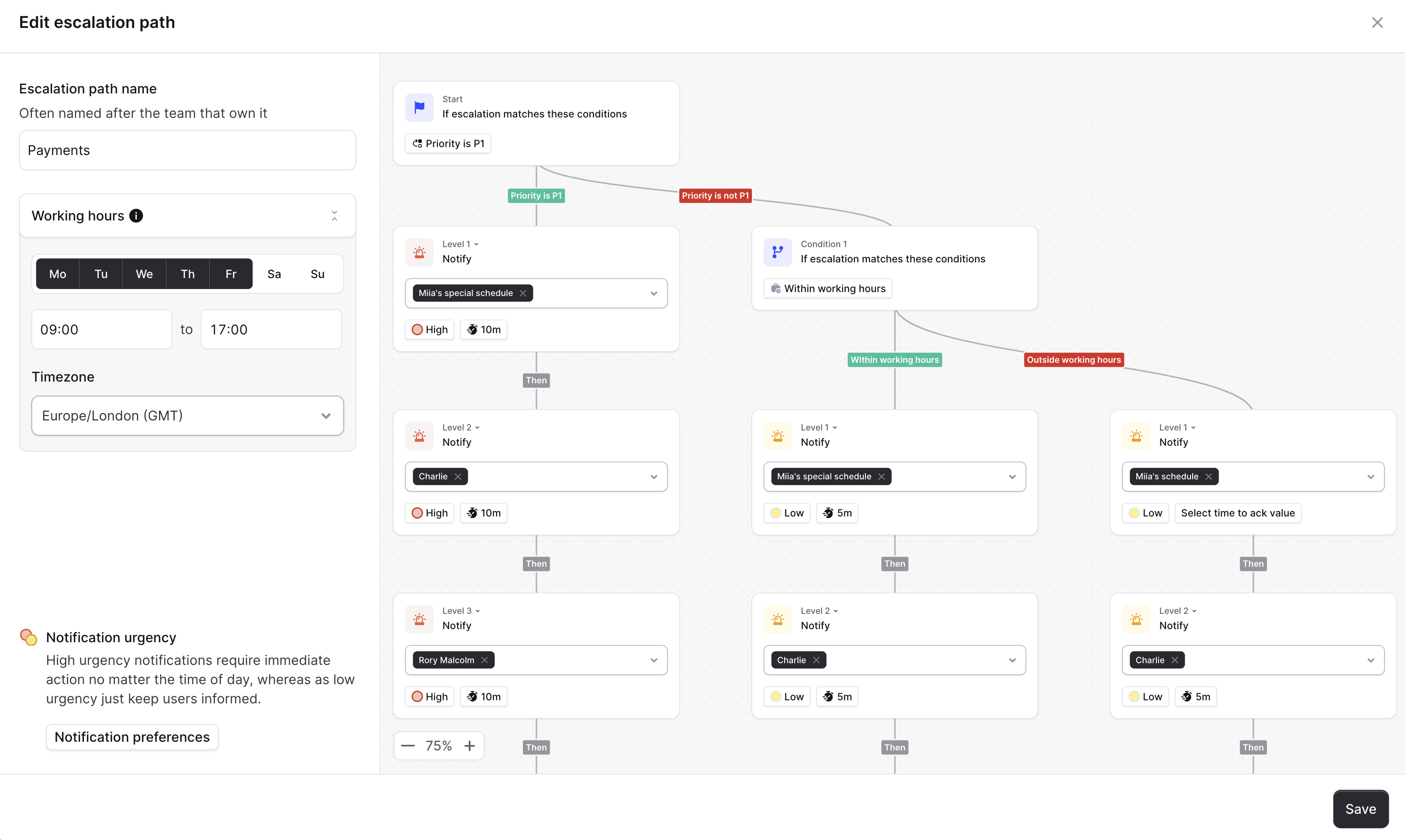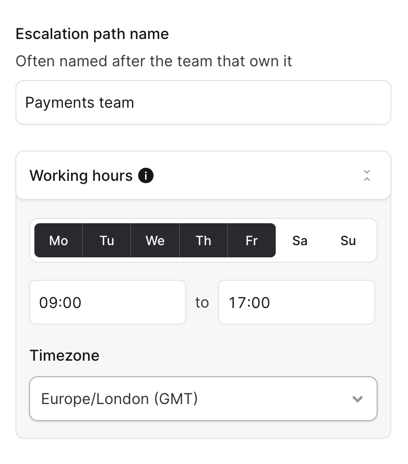 Setting up working hours will create the working hours for all levels in the escalation path created. You can choose the days, times, and the timezone. We don’t currently support different working hours per level.