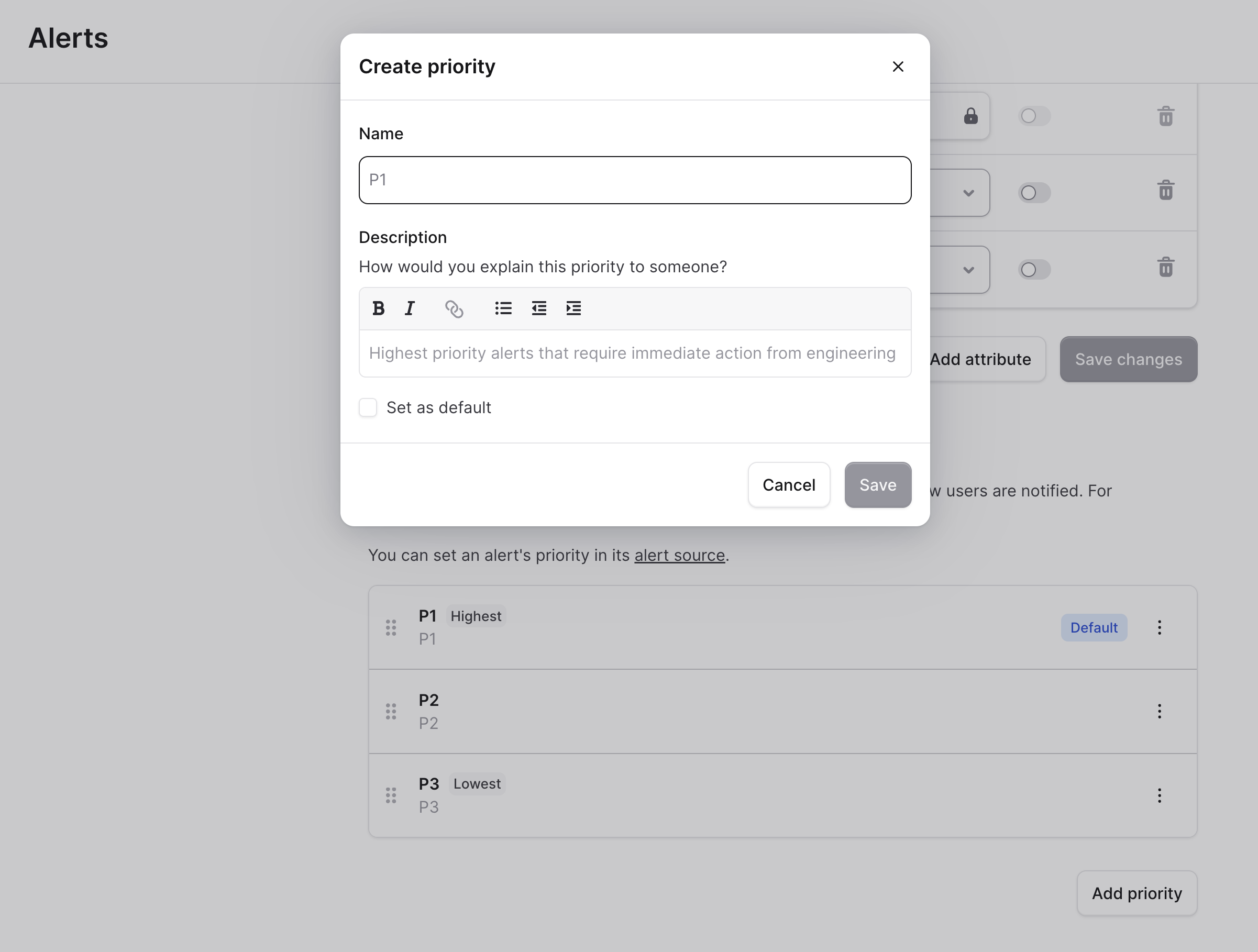 To use priorities in the escalation path branches, you can create them in Alert Attribute settings . Priorities are now a first-class citizen in incident.io, which means that you wouldn’t need to create those as a custom field in the catalog just to connect with your alert source.Create your priorities in incident.io